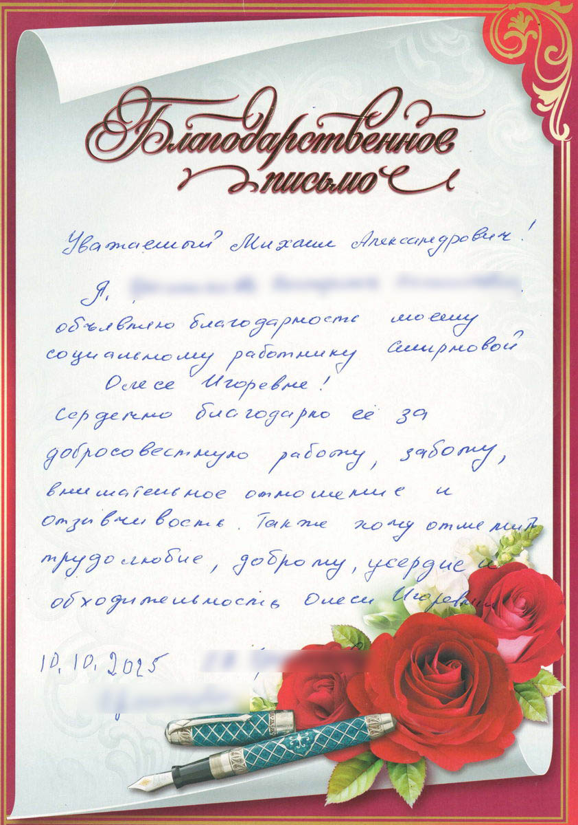 Благодарности от наших подопечных всегда мотивируют сотрудников Центра на дальнейшую плодотворную работу. Для нас так важны эти добрые и теплые слова, которые напоминают нам, что все усилия не проходят незамеченными и что забота может изменить жизнь к лучшему.