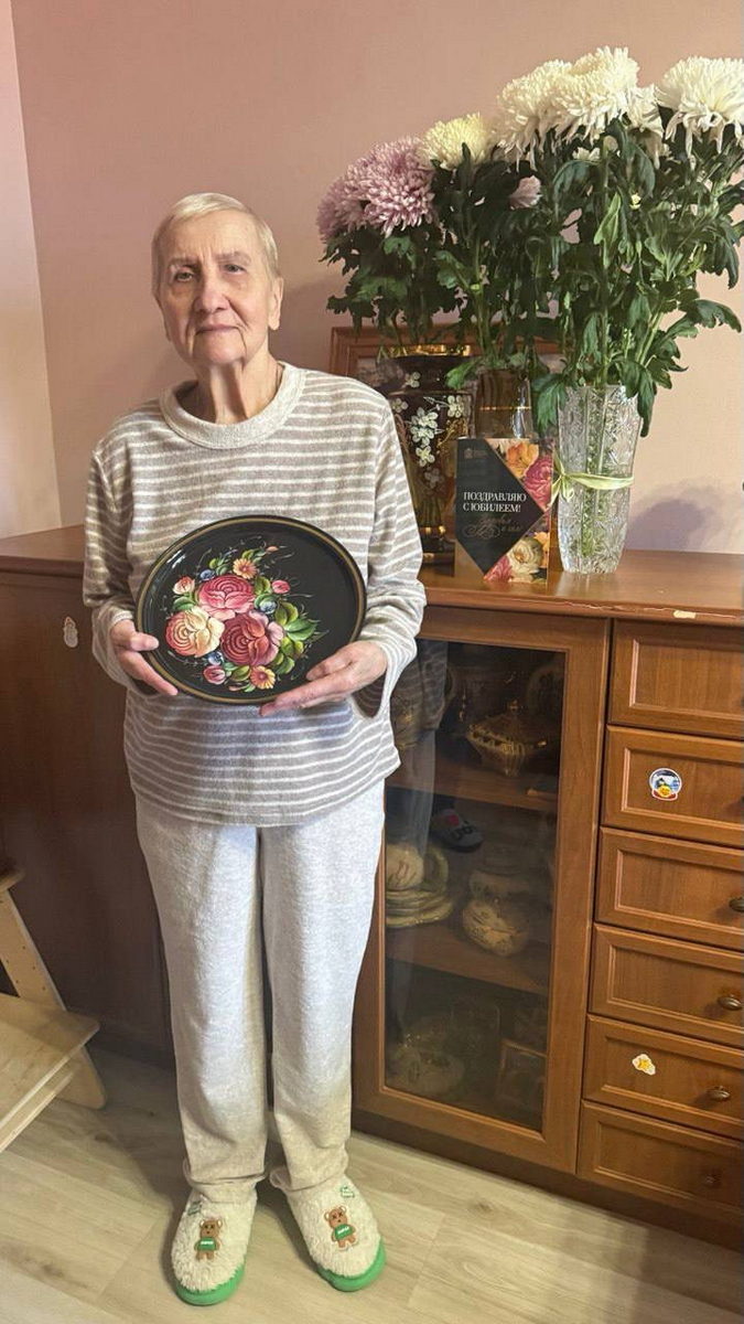 Также юбилярам вручают подарки от губернатора Московской области – прекрасные яркие жостовские подносы и павлопосадские платки.
