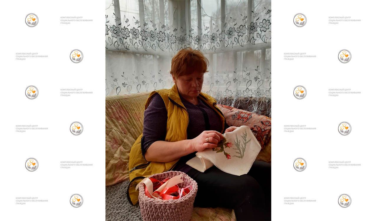На фото: получательница социальных услуг нашего Центра Иконникова Ирина Валерьевна за любимым занятием и ее готовые творческие работы.