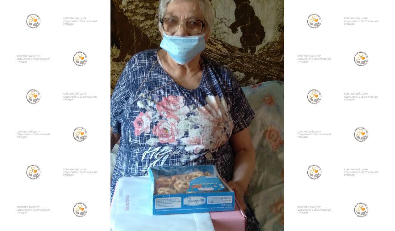 На фото: получательница социальных услуг Федотова Антонина Петровна в день своего юбилея принимает поздравления от сотрудников Центра.