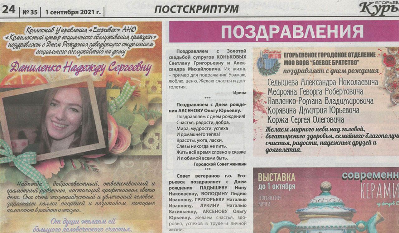 На фото: поздравление в адрес заведующей одним из отделений Центра Даниленко Надежды Сергеевны, опубликованное в газете «Егорьевский курьер».