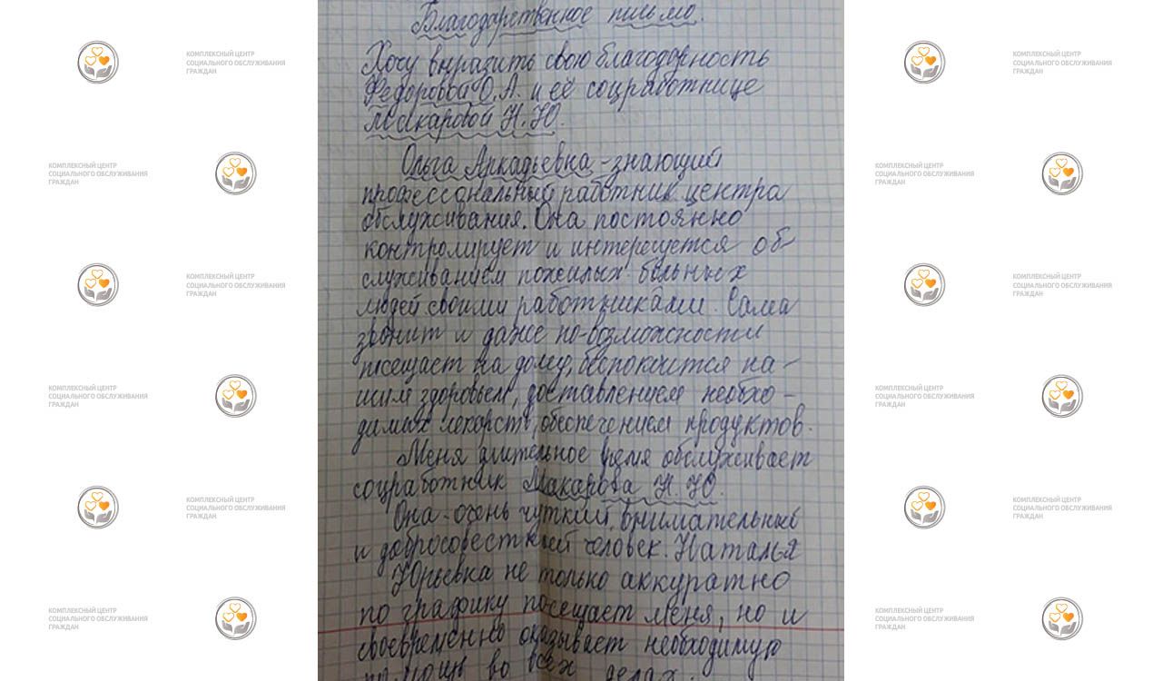Труд социальных работников очень важен и нужен людям. В этой профессии случайных людей не бывает. Получатели социальных услуг чувствуют искренность и установить по-настоящему добрые отношения можно только, если социальный работник относится к своим подопечным с уважением и должным вниманием, как к родных и близким людям. Всю работу сотрудники Центра делают с душой, поэтому каждое утро хочется спешить к подопечным, а день пролетает незаметно в делах и хлопотах. Каждый получатель социальных услуг постепенно становится близким человеком, поэтому так часто наши подопечные в адрес своих социальных работников пишут благодарности и теплые слова. Очень трогательные и душевные благодарственные письма дают социальным работникам Центра стимул для дальнейшей плодотворной работы и поднимают настроение. Спасибо за такие добрые отзывы!