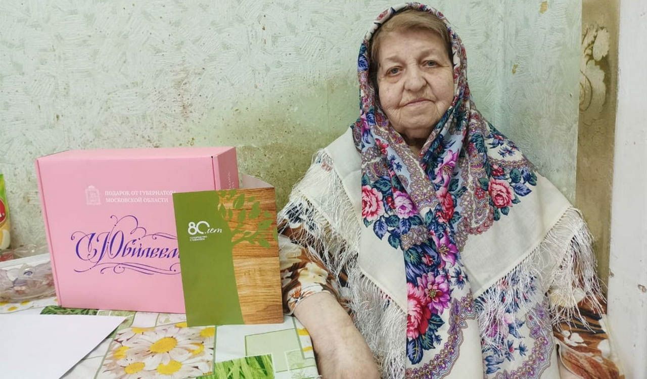 На фото: получательница социальных услуг нашего Центра Трифонова Ольга Гавриловна принимает подарки и поздравления.