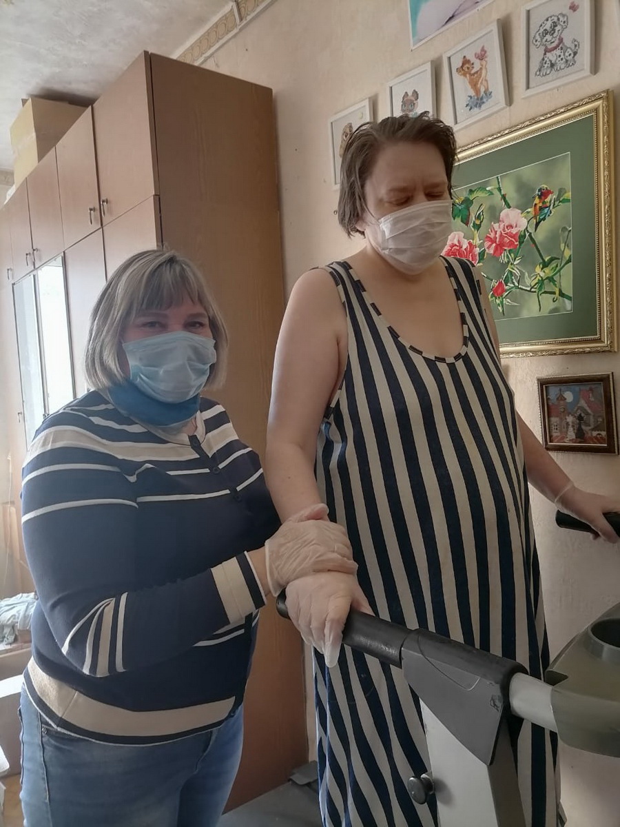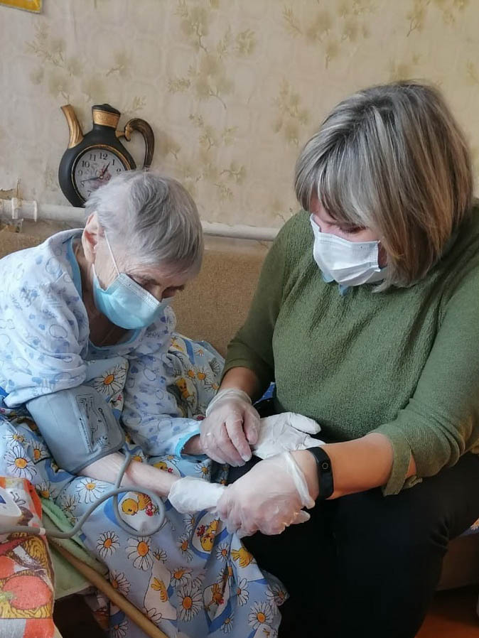 На фото: социальный работник Центра Черабай Т.И. измеряет давление получательнице социальных услуг Тихоновой Т.А. и помогает заниматься лечебной физкультурой получательнице социальных услуг Терентьевой З.П.