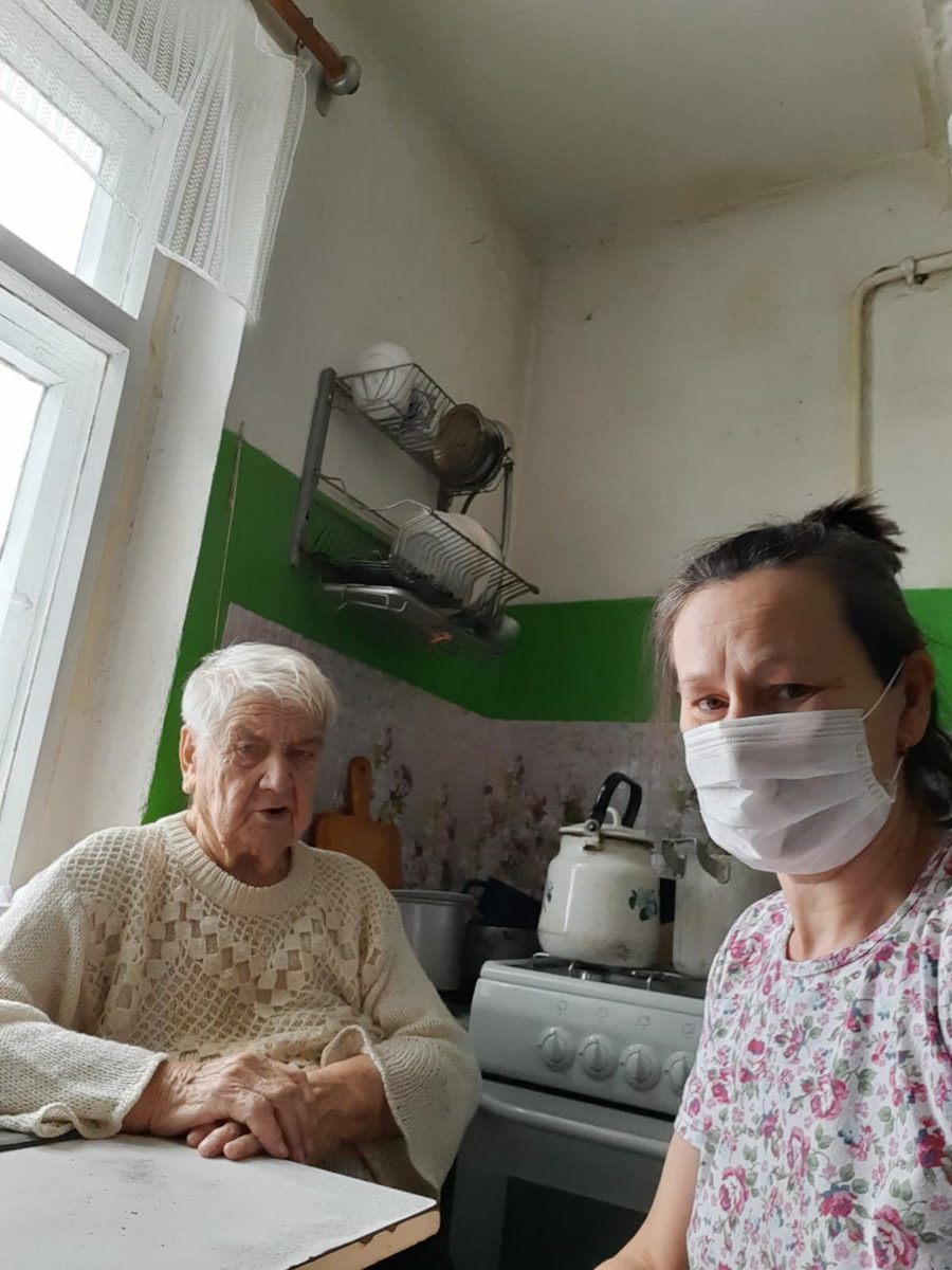На фото: получательница социальных услуг нашего Центра Альбина Александровна Рыжова и ее социальный работник Надежда Евгеньевна Шутова на фоне новой газовой плиты.
