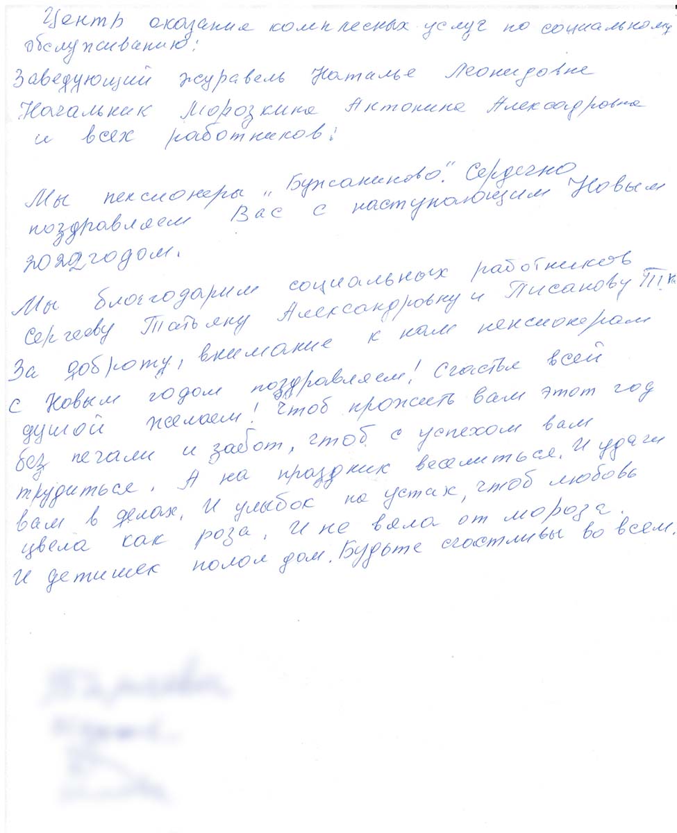 На фото: получатели социальных услуг нашего Центра с наряженными праздничными елками и поздравительное письмо от наших подопечных, проживающих в селе Бужаниново.