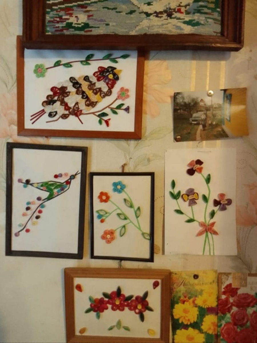 На фото: получательница социальных услуг нашего Центра Шевшунова Александра Александровна и ее творческие работы в технике квиллинг.