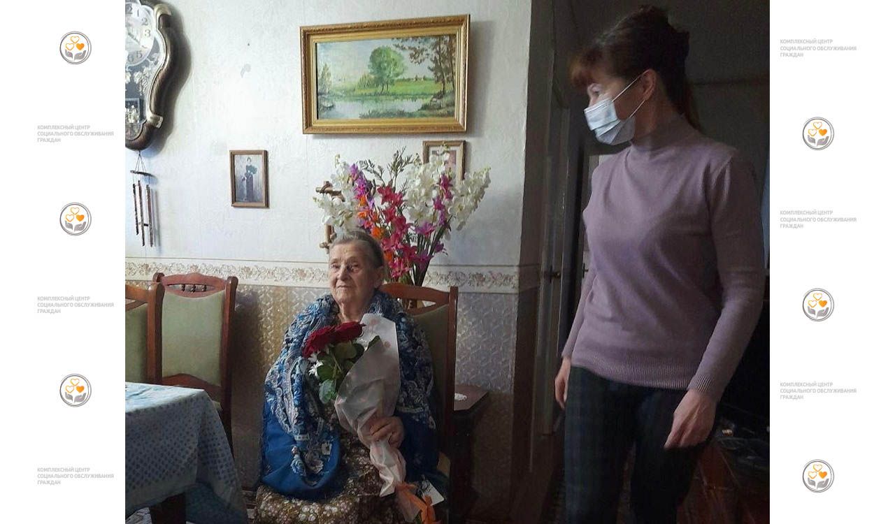 На фото: получательница социальных услуг нашего Центра Ахапкина Зинаида Васильевна принимает поздравления в связи со 100-летним юбилеем.