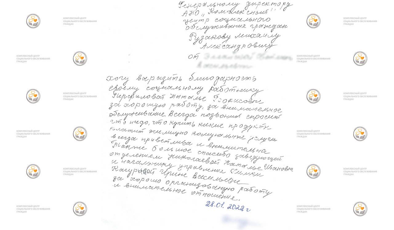 Получательница социальных услуг Центра Элланская Светлана Васильевна передала благодарственное письмо в адрес своего социального работника. «Хочу выразить благодарность своему социальному работнику Перфиловой Наталье Борисовне за хорошую работу, за внимательное обслуживание. Всегда позвонит спросит - что купить, что надо, какие продукты, оплатит жилищно-коммунальные услуги. Всегда приветлива и внимательна», - говорится в письме. Мы искренне рады, что помощь социальных работников Центра так важна для наших подопечных и так востребована. Мы будем и дальше прикладывать все усилия для того, чтобы оказывать всестороннюю поддержку получателям социальных услуг нашего Центра и делать это на самом высоком уровне.