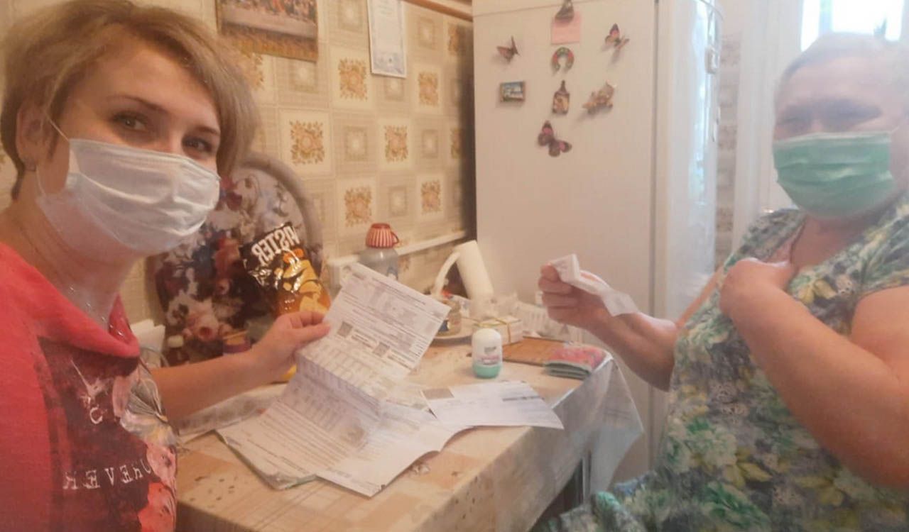 На фото: социальный работник Центра Сарычева Екатерина Борисовна помогает получательнице социальных услуг Центра Назаровой Ольге Евгеньевне разобраться в платежных документах за коммунальные услуги.