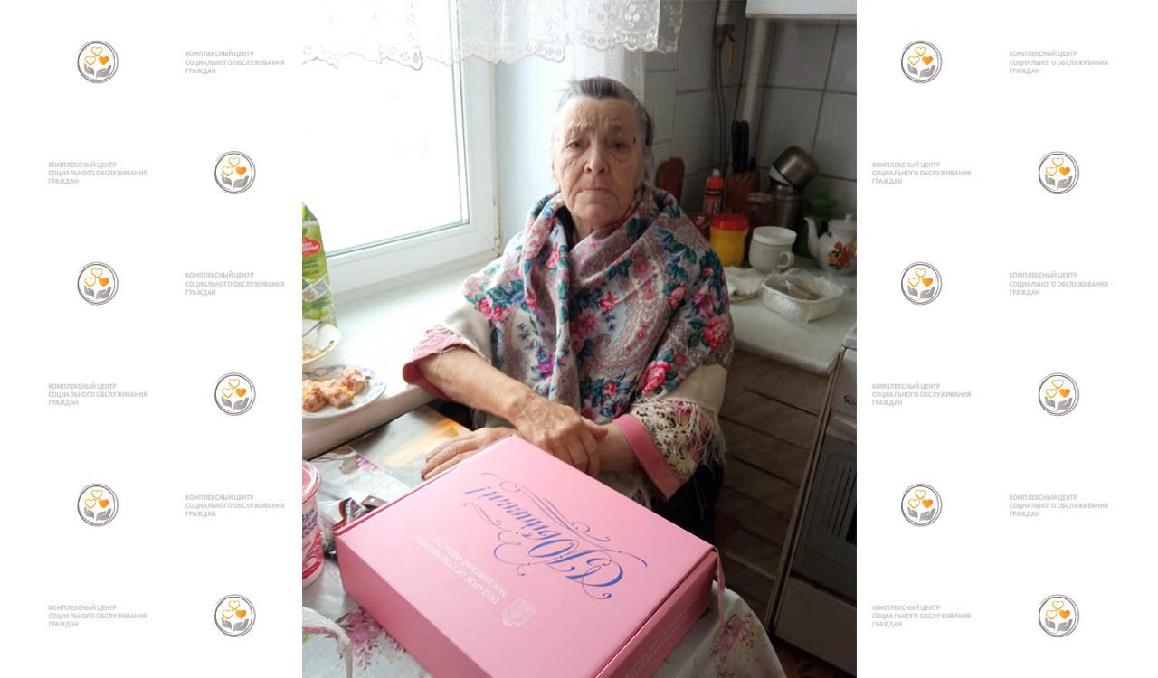 На фото: получательница социальных услуг Геберт Прасковья Васильевна принимает поздравления и подарки в честь юбилея.