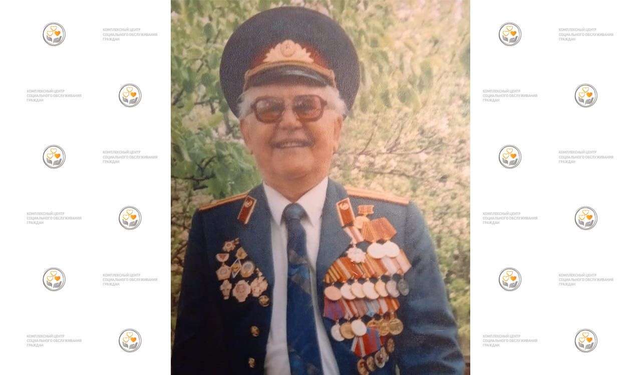 На фото: получатель социальных услуг Центра Филимонов Иван Макеевич принимает поздравления с 95-летним юбилеем и снимок из личного архива в парадной форме.