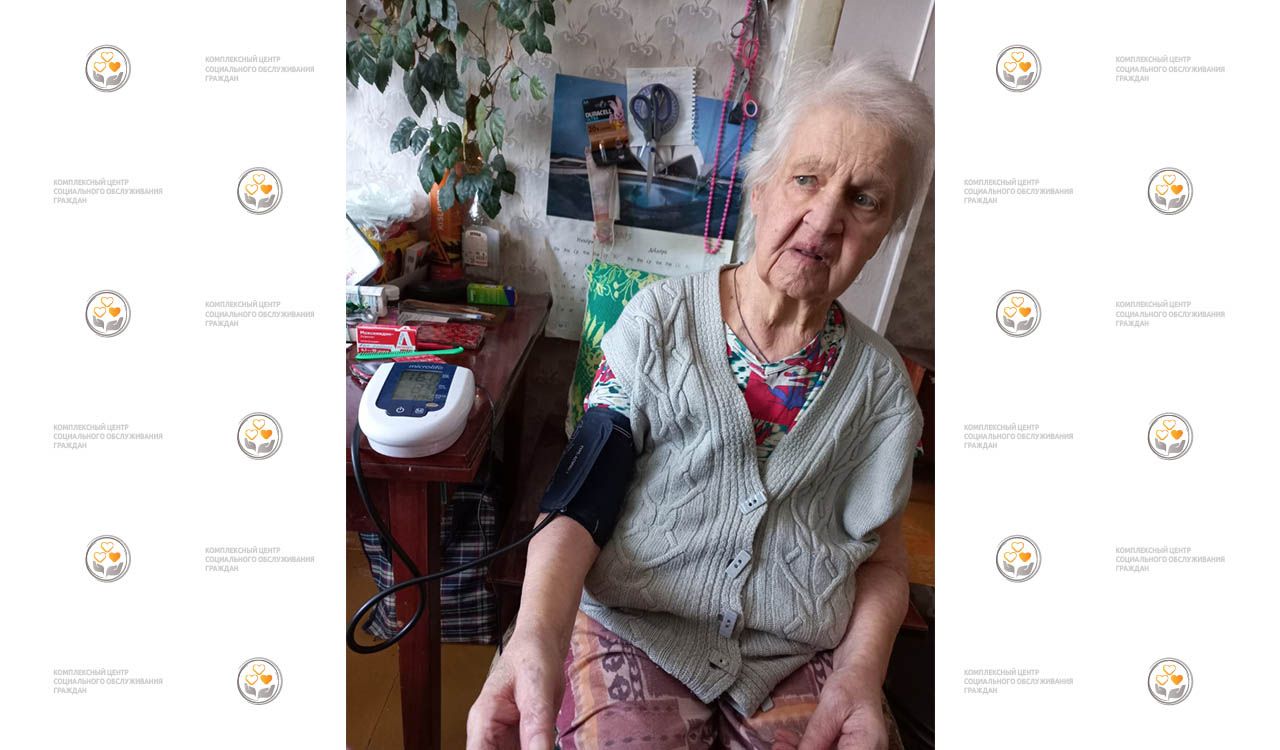 На фото: получательница социальных услуг Центра Нечаева Лидия Андреевна измеряет артериальное давление.