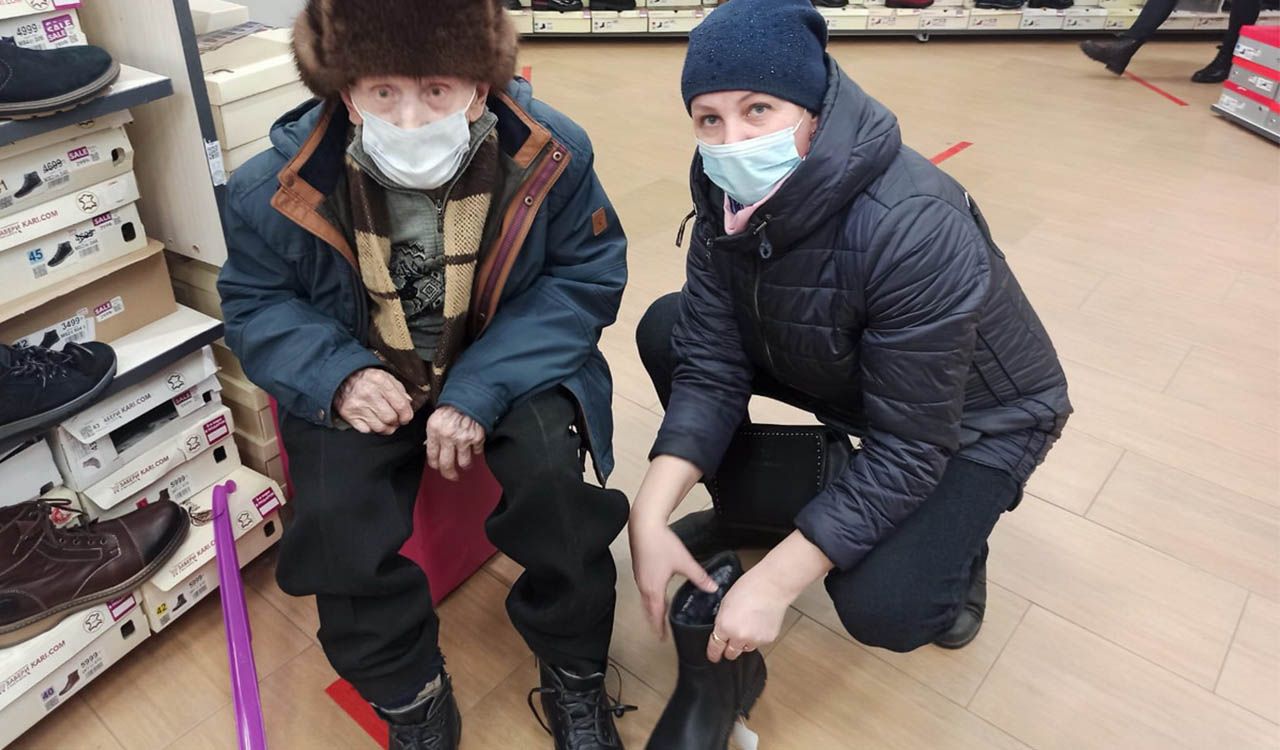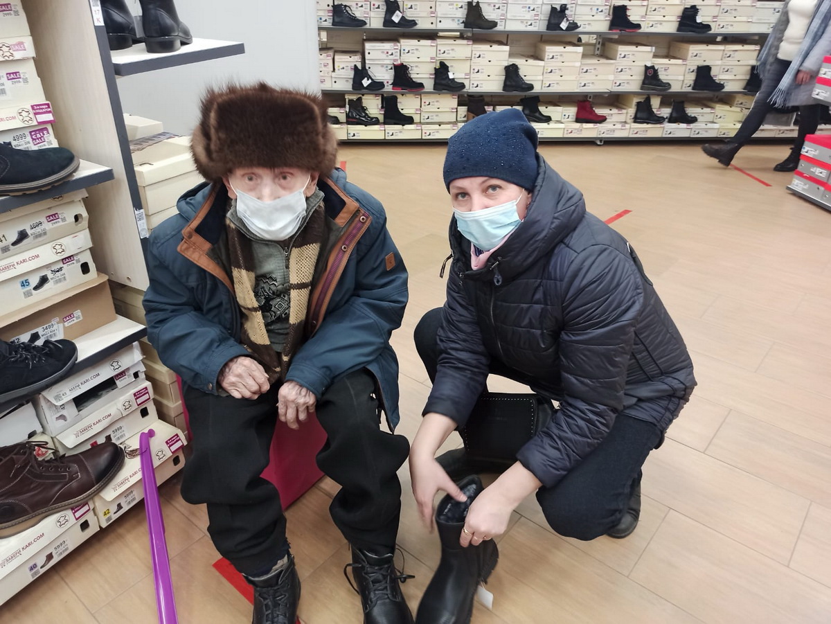 На фото: социальный работник Центра Коробкова Ирина Владимировна вместе с получателем социальных услуг Востриковым Петром Васильевичем во время посещения обувного магазина.