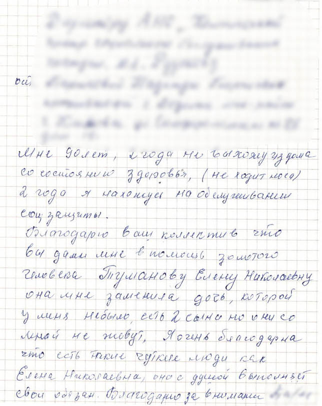 В нашем Центре трудится социальный работник Туманова Елена Николаевна - очень добрый, ответственный и душевный человек. Елена Николаевна обладает огромным профессиональным опытом, работает в сфере социального обслуживания более 20 лет. Она не только своевременно и качественно оказывает все необходимые услуги, но и окружает получателей социальных услуг заботой и вниманием. Все её подопечные очень любят Елену Николаевну, с нетерпением ждут ее прихода и благодарны ей за чуткость и внимание. Не так давно в ее адрес поступило благодарственное письмо, в котором получательница социальных услуг Центра Паршкова Надежда Георгиевна сердечно благодарит свою помощницу и коллектив Центра. «Благодарю ваш коллектив, что вы дали мне в помощь золотого человека – Туманову Елену Николаевну. Она заменила мне дочь», - пишет Надежда Георгиевна. Мы очень рады, что помощь сотрудников Центра столь важна и нужна нашим подопечным и гордимся тем, что в нашем коллективе трудятся такие сотрудники!