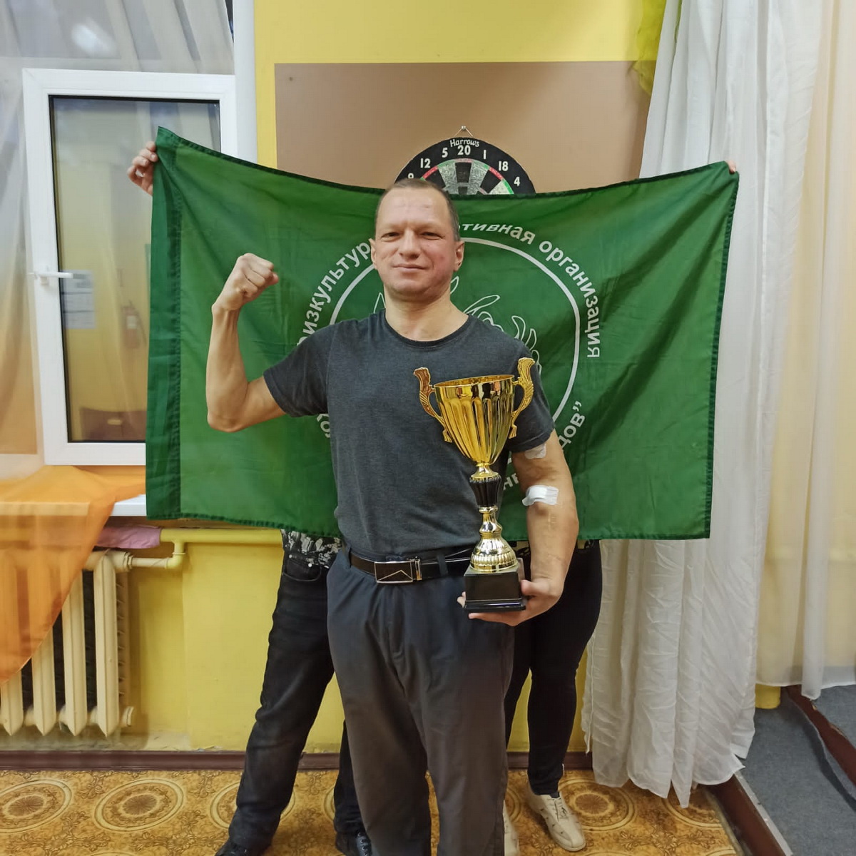 На фото: получатель социальных услуг нашего Центра Гусев Максим Викторович и его почетная награда за первое место, которое он занял в турнире по спортивным настольным играм.