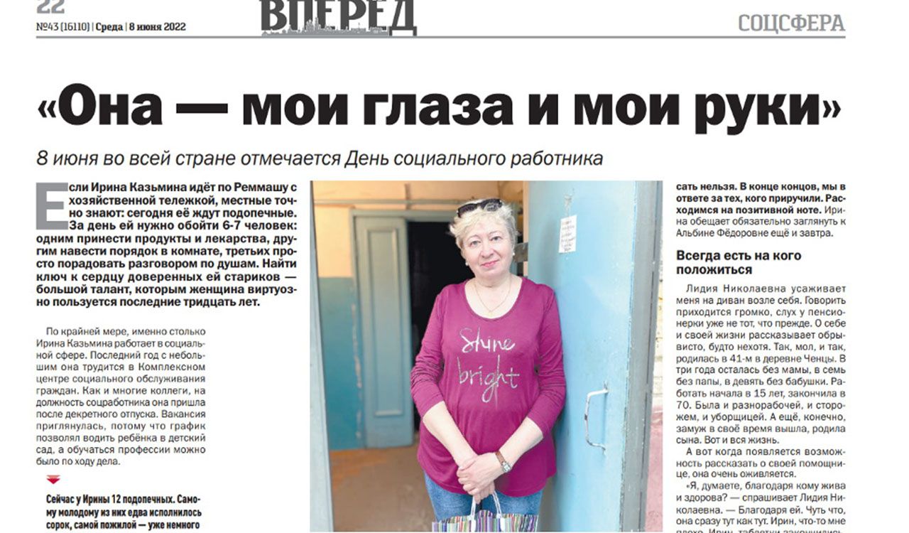 В честь профессионального праздника – Дня социального работника издание Сергиево-Посадского городского округа «Вперед» посвятило большую публикацию рассказу о буднях социального работника нашего Центра Казьминой Ирины Николаевны. Корреспондент вместе с социальным работником посетил ее подопечных, чтобы лично расспросить о том - насколько они довольны обслуживанием и отношением. Все получатели социальных услуг очень тепло и с большой благодарностью отзывались о работе Центра и о своей помощнице Ирине Николаевне. Социальный работник – это не только человек, который приносит продукты и справляется с бытовыми делами. Это надежный друг, внимательный слушатель, опытный советчик. Ирина Николаевна работает в социальной сфере более 13 лет и точно знает, что помимо профессионального опыта и навыков для социального работника важно иметь доброе сердце. Нам очень приятно, что деятельность сотрудников Центра находит такой отклик, и что в СМИ появляются публикации, которые прославляют эту важную и очень нужную профессию!