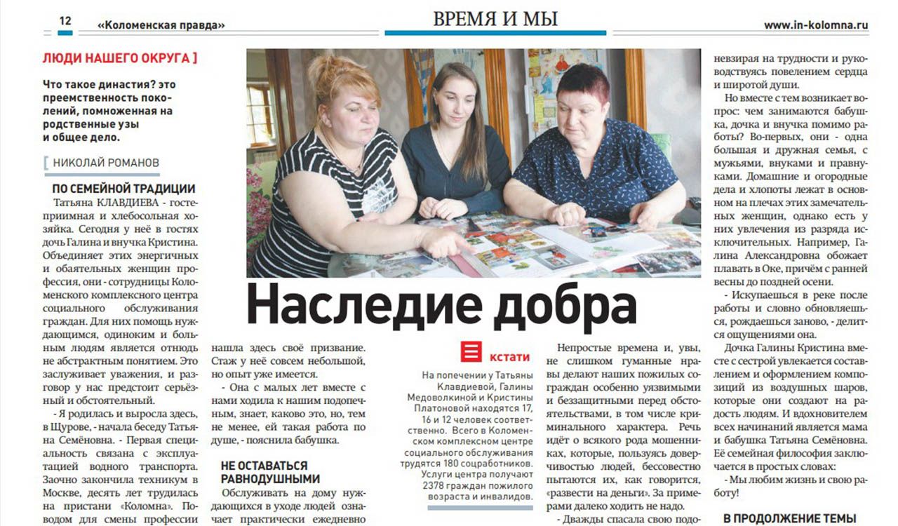 Не так давно в честь Дня социального работника о сотрудниках нашего Центра, прекрасной семейной династии вышла статья в газете «Коломенская правда». На фото в газете - Татьяна Семеновна Клавдиева, ее дочь Галина и внучка Кристина. Объединяет этих энергичных и обаятельных женщин профессия, они все трудятся социальными работниками в нашем Центре.