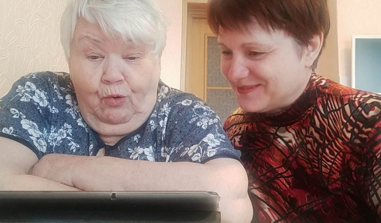 На фото: социальный работник Глазкова Татьяна Владимировна делится со своей получательницей социальных услуг Смирновой Галиной Васильевной впечатлениями о фотовыставке.