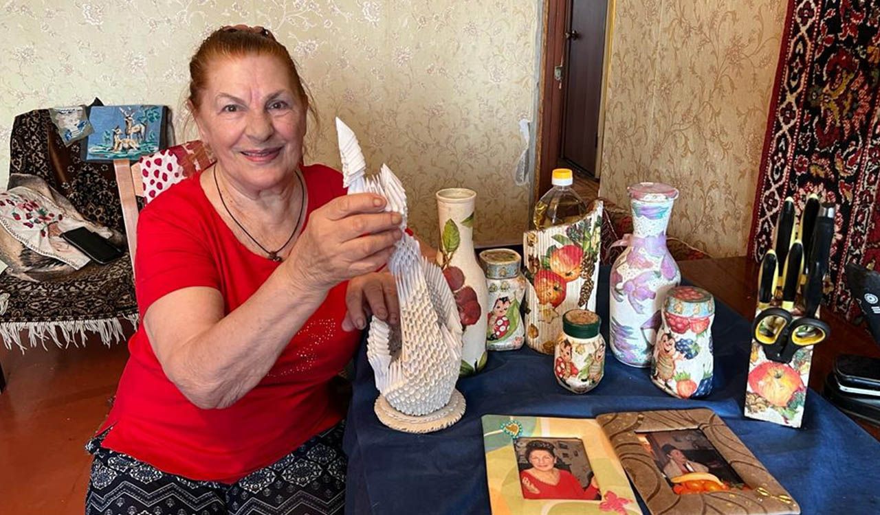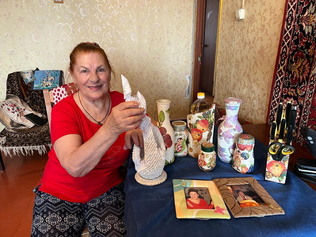 На фото: получательница социальных услуг Центра Максина Долли Ивановна и ее творческие работы.