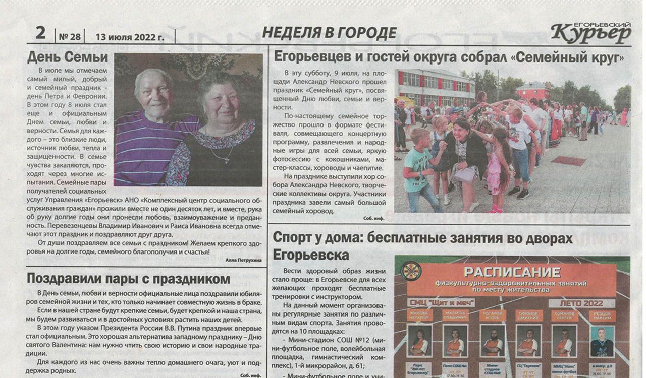 На фото: статья в газете «Егорьевский курьер» с поздравлением наших получателей социальных услуг Перевезенцевых Владимира Ивановича и Раисы Ивановны.