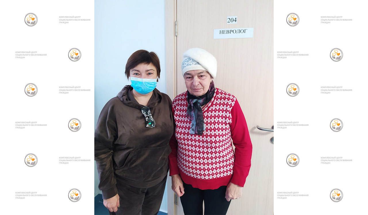 На фото: социальный работник Центра Туманова Елена Николаевна с получательницей социальных услуг Центра Волковой Верой Владимировной ждут приема врача.