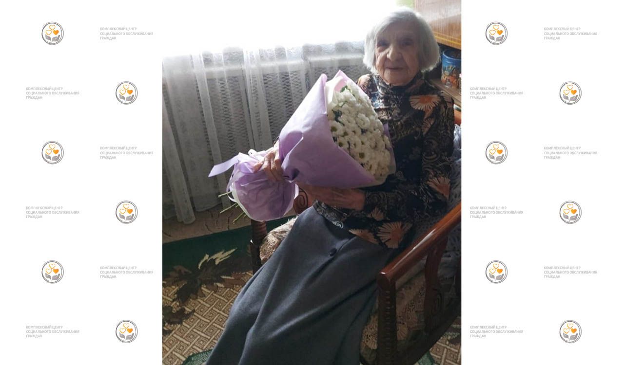 На фото: получательница социальных услуг нашего Центра Манакова Людмила Лазаревна в день своего рождения принимает поздравления.