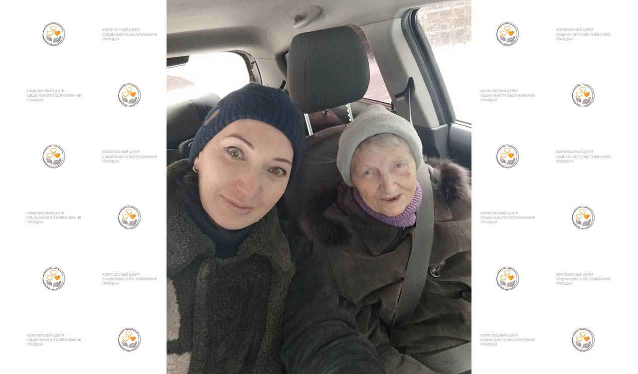 На фото: социальный работник Центра Сахарова Екатерина Александровна сопровождает получателей социальных услуг в медицинские учреждения.