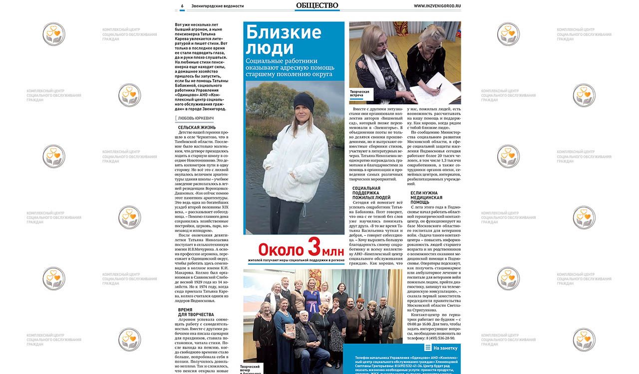 На фото: публикация в газете «Звенигородские ведомости», посвященная получательнице социальных услуг Центра Каревой Татьяне Николаевне.