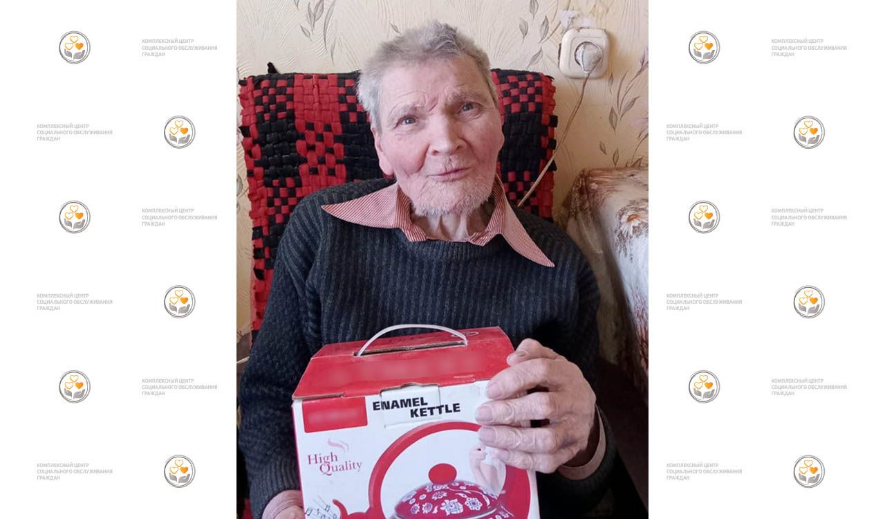 На фото: получатель социальных услуг Шпатов Анатолий Васильевич принимает подарки и поздравления с юбилеем.