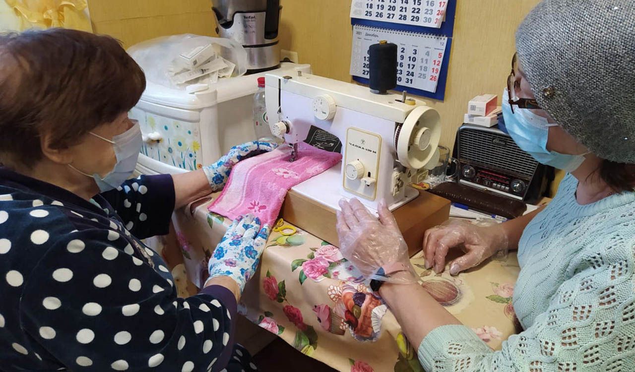 На фото: социальный работник Центра Амелина Татьяна Николаевна помогает освоить получательнице социальных услуг Центра Марковой Нине Кузьминичне швейную машинку.