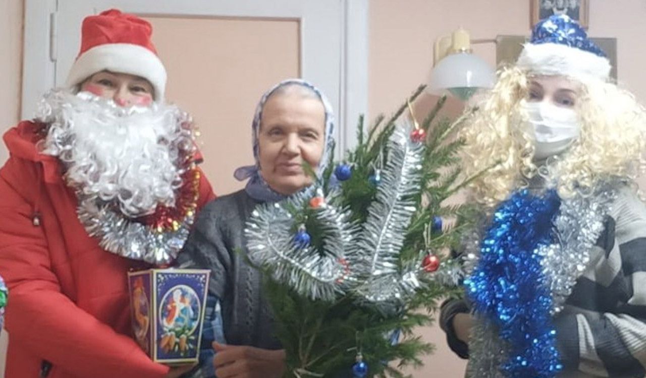 На фото: сотрудники Центра поздравляют получателей социальных услуг Центра с новогодними праздниками.