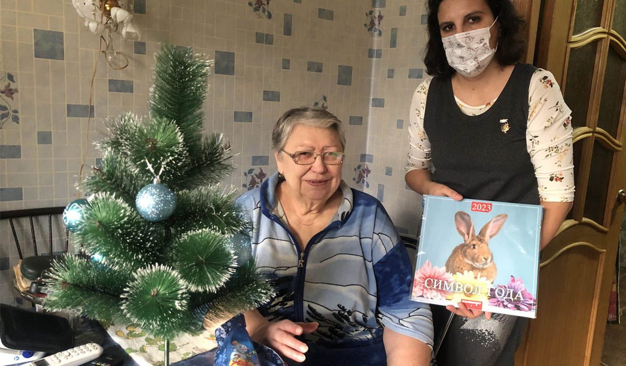 На фото: заведующая одним из отделений Центра Толкушева Мария Алексеевна вместе с социальным работником Центра Карповой Олесей Александровной поздравляют нашу подопечную Чебан Нину Николаевну с наступающим праздником.