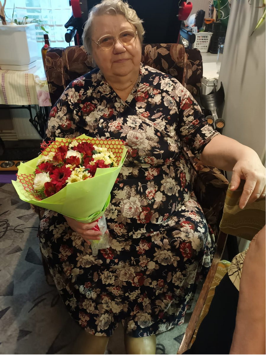 Сотрудники Центра делают все возможное, чтобы в жизни наших получателей социальных услуг было как можно больше поводов для счастья, улыбок и радостных впечатлений. Поздравления с праздниками и днями рождения – несомненно прекрасный повод, чтобы порадовать подопечных нашего Центра подарками, поздравлениями и приятными сюрпризами. Вот и социальный работник Центра Нисина Елена Юрьевна организовала для своей получательницы социальных услуг Павловой Валентины Георгиевны яркий праздник - подарила красивый букет и украсила комнату, а Валентина Георгиевна пригласила соседок на праздничное угощение. В послевоенные годы маленькой девочкой она осталась без мамы, жила в тяжёлых условиях, было очень трудно, но она выучилась на телефонистку. Валентина Георгиевна всю жизнь посвятила этой работе, трудилась в Звенигородской АТС. С годами здоровье стало подводить, после выхода на пенсию наша подопечная не выходит из дома, передвигается по дому на костылях. Валентина Георгиевна очень благодарна своему социальному работнику за внимание, заботу, неравнодушие и тёплое отношение к пожилым людям! Еще раз поздравляем ее с юбилеем и желаем, чтобы в жизни было как можно больше праздников и поводов для веселых и душевных посиделок.