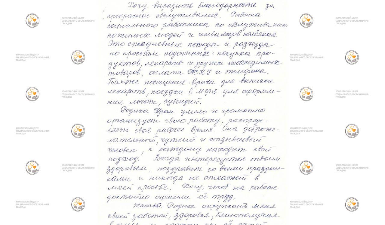 За свой профессиональный труд наши социальные работники получают множество благодарностей от своих подопечных не только в устной форме, но и в письменном виде. «Хочу выразить благодарность социальному работнику Р. И. Кром. Я пожилой человек, живу одна и не могу обслуживать себя. Она помогает мне, приносит продукты, платит квартплату, записывает и провожает к врачу. Делает, что попрошу. Спасибо ей», - пишет в своем благодарственном письме получательница социальных услуг Центра Новожилова З.А.