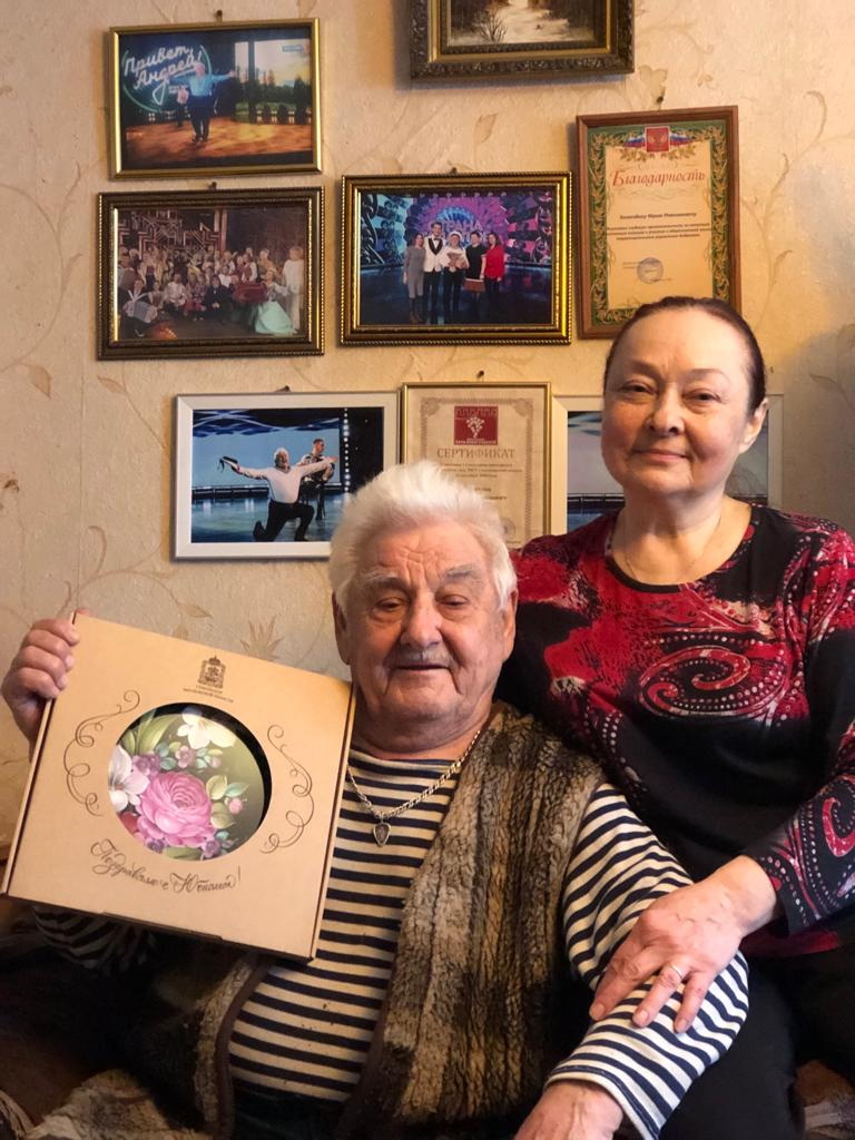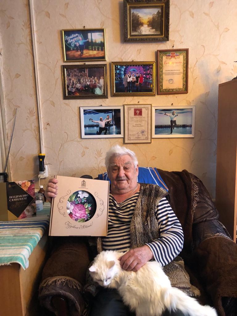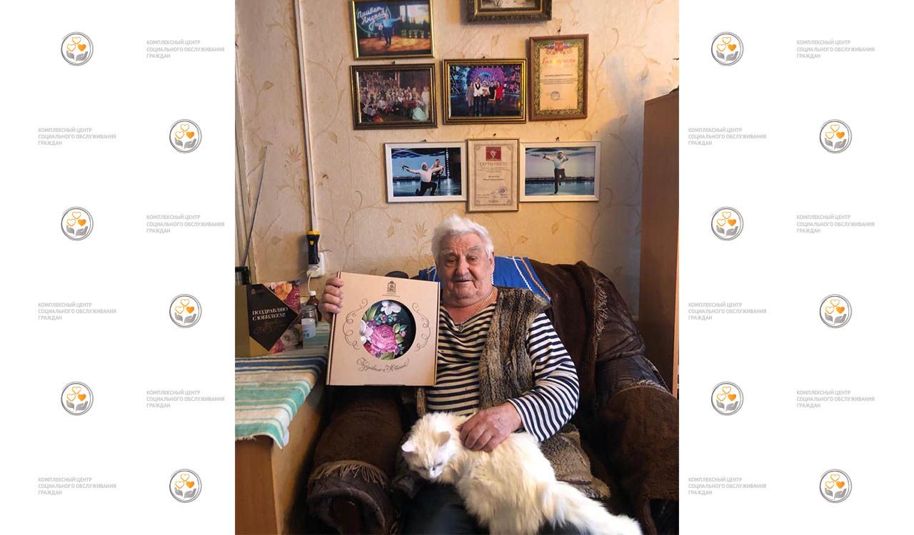 На фото: юбиляра пришла лично поздравить социальный работник Центра Кувшинова Еленаотдыхать, получатель социальных услуг Центра Загвоздин Юрий Максимович встретил ее вместе со своей любимицей - кошкой Белянкой.