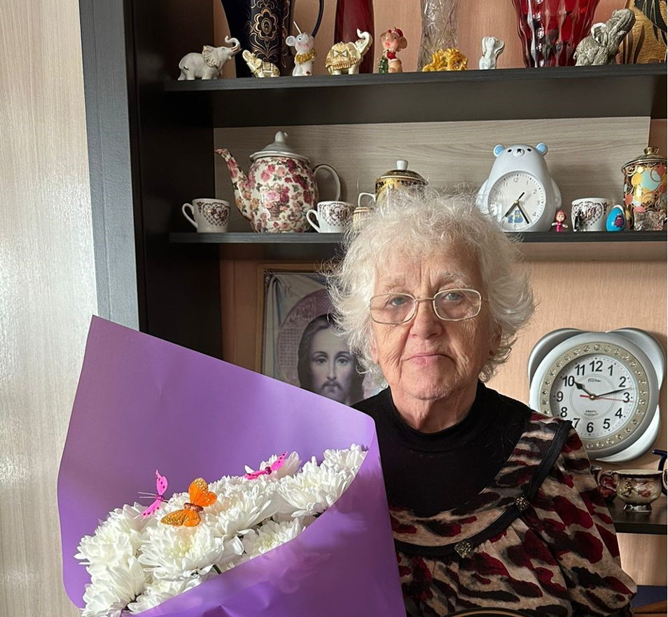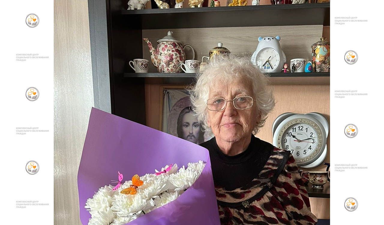 На фото: получательница социальных услуг Центра Акимова Светлана Исааковна принимает поздравления с 80-летним юбилеем.