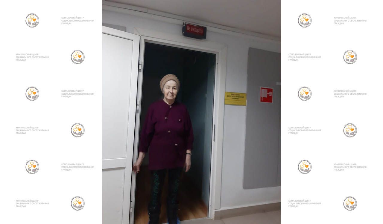 На фото: получательница социальных услуг Пименова Екатерина Николаевна пришла в поликлинику для прохождения диспансеризации в сопровождении социального работника Центра Федоровой Светланы Викторовны.